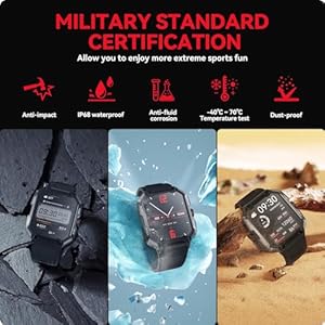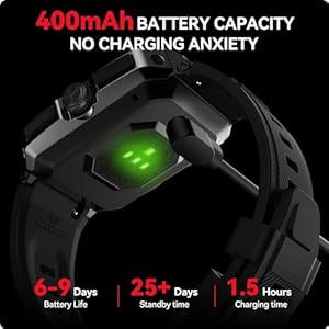 【Durable & Waterproof Design】 Built with special composite materials and metal, this watch is crack, dust, and water-resistant (IP68), making it ideal for harsh environments. It has a large battery that lasts up to 7 days of continuous use.