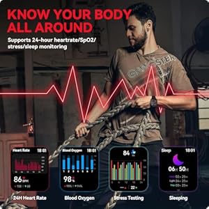 【Comprehensive Health Monitoring】 This fitness watch monitors your heart rate 24/7, tracks sleep patterns, and offers reminders to stay active and hydrated. It also includes stress testing to keep you in top shape.